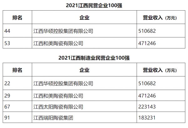 12月13日,江西省政府新闻办、江西省工商联主办的2021江西民营企业100强暨社会责任报告新闻发布会在南昌召开。会上发布了2021江西民营企业100强、2021江西制造业民营企业100强、2021江西民服务业民营企业20强榜单。其中,华硕控股、江西和美、太阳陶瓷、瑞阳陶瓷4家江西建陶企业上榜。
