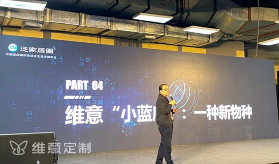 最后一点跟大家重点分享一下维意定制整装的小蓝店,一种新物种。我上次跟欧阳总对话的时候,第一次听到小蓝店这个词,我就觉得非常有意思。因为蓝色是维意定制的一个主要色调,同时蓝色也是容易让人联想到梦想、未来、科技的颜色,跟维意定制所践行的BIM科技整装,我觉得是一脉相承的。
