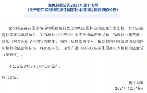 新浪定制频道讯 12月16日,海关总署发布2021年第110号公告称,为防止松材线虫传入,根据我国相关法律法规和国际植物检疫措施标准,经风险评估,自2022年2月1日起,来自松材线虫疫区(主要指加拿大、日本、韩国、墨西哥、葡萄牙、西班牙、美国)的松木(包括原木和锯材)应从指定进口口岸进口,并需符合一定的检疫要求,只有进境检疫合格的方准予入境。其中,若检测出松材线虫的松木(包括原木和锯材)将作退运或销毁处理。
