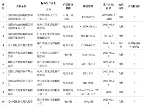2021年辽阳市流通领域家用电器产品质量监督抽查企业名单