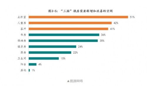 从实际偏好调查来看,二胎家庭更倾向于三居室,三胎家庭是更倾向于四居室的。这是因为,孩子的成长是一个长周期的过程,会对户型的灵活性提出高要求,所以,未来“3+1”和“4+1”等生活空间,无疑将得到“三胎”家庭的青睐。而在购房或者换房过程中,三胎家庭对主卧、儿童房、客厅三大空间要求最高。