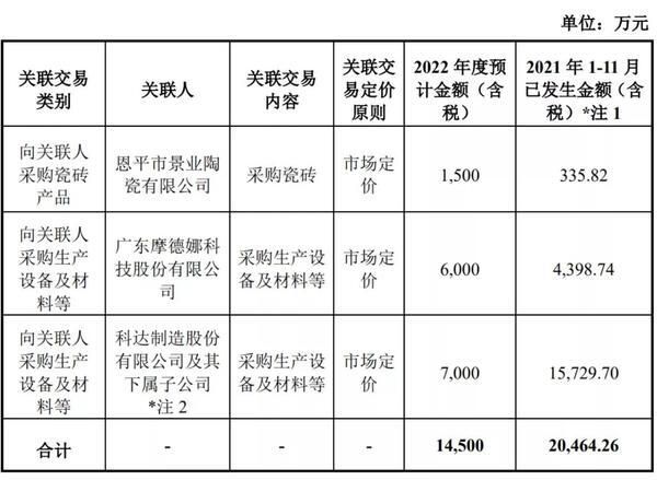 这1.45亿元的具体交易内容,包括向广东摩德娜科技股份有限公司(以下简称“摩德娜”)采购生产设备及材料6000万元,向科达制造股份有限公司及其下属子公司(以下简称“科达制造”)采购生产设备及材料7000万元,以及向恩平市景业陶瓷有限公司(以下简称“景业陶瓷”)采购1500万元的瓷砖产品。