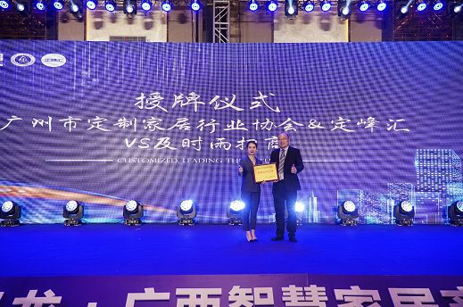 1月6日,走进红星美凯龙·广西智慧家居产业园暨定峰汇、广州市定制家居行业协会2022年会现场。定峰汇创始人杨峰授予及时雨招商创始人谢雨沙战略合作伙伴。