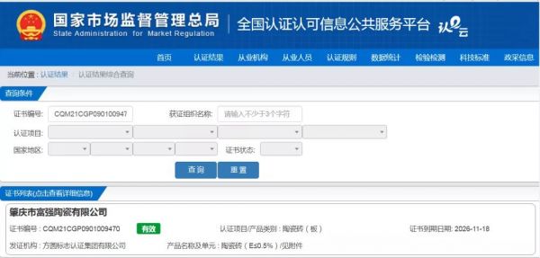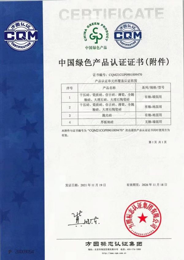 此外,中国绿色产品认证有别于其他环保认证,不仅对产品的环保性能包括VOC、甲醛、苯等有害物质的限制,还意味着每一片瓷砖从原料、运输、生产、品质等每一个环节都严格把控。