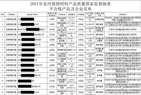 采暖装修你有没有踩过坑?是否遇到过使用了没多久的暖气片漏水、暖气片没有隔壁邻居家里暖和等等问题?你有怀疑过是暖气片本身的质量问题吗?一起来看看国家市场监督管理总局于2021年12月30日发布了一则关于2021年室内装修材料产品质量国家监督抽查情况通报,其中关于就包含了暖气片散热器的抽查情况,抽查结果显示15批次采暖散热器产品不合格,不合格发现率为13.8%。