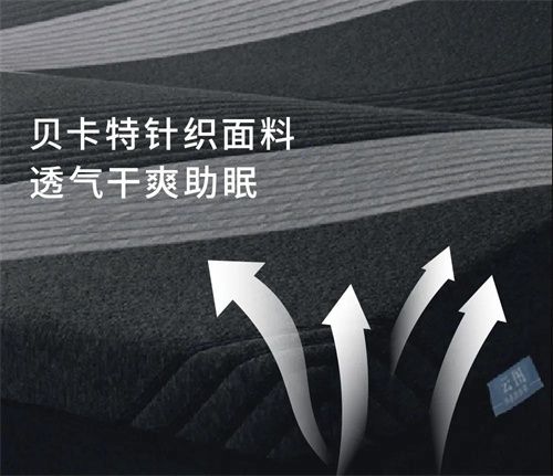 表层面料为贝卡特针织面料,极具弹性和延展性,让床垫伸展自如。面料亲肤细腻,告别黏腻潮湿,干爽一整晚。
