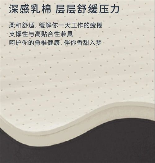 源自东南亚黄金产区的高浓度天然乳胶,具有超高的弹性和贴合度,搭配深感乳棉,支撑性和高贴合性兼具,层层释压,缓解工作一天后积累的疲惫,伴你香甜入梦。