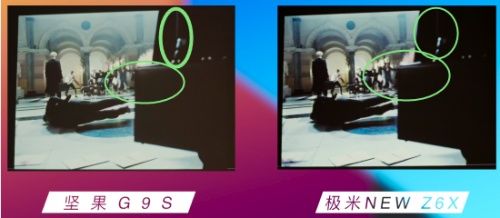 从实测对比图中可以看出,坚果G9S在画面暗部上处理得更加精细,最直观的可以看圈起来的钢琴立柱和漆面部分,极米的立柱已经完全看不清晰,与大面积的黑色融为一体,而坚果G9S的还有清晰且有层次感的完整轮廓。漆面上,极米NEW Z6X的同样是一片漆黑,而坚果G9S这边,还有渐变与顶端光泽交织的类金属质感。这就是先进的MT9669芯片带来的更加优秀的HDR色彩解析能力。