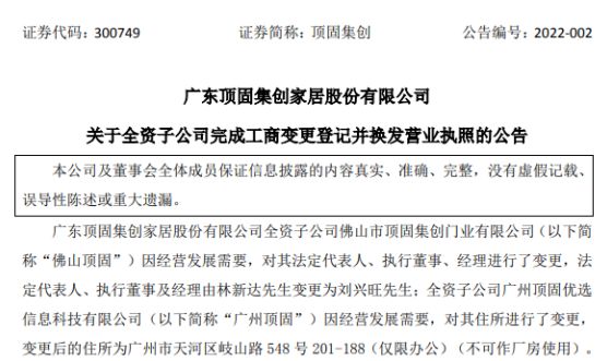 1月12日,广东顶固集创家居股份有限公司发布关于全资子公司完成工商变更登记并换发营业执照的公告。公告显示,法定代表人、执行董事及经理由林新达变更为刘兴旺。