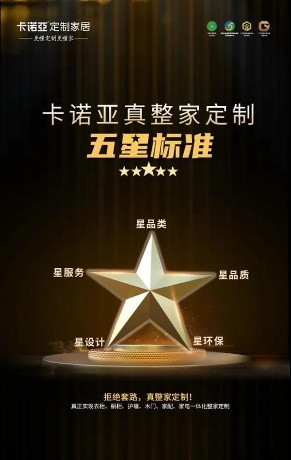 新浪定制频道讯 1月11日,卡诺亚独创的真整家定制5星标准(星品类、星品质、星环保、星设计、星服务)、4大支撑点(5大基材、5大风格、6大品类、9大空间),从战略到战术形成闭环和无缝衔接,是真正意义上的整家定制,推动整个行业一起迈入整家定制新纪元。
