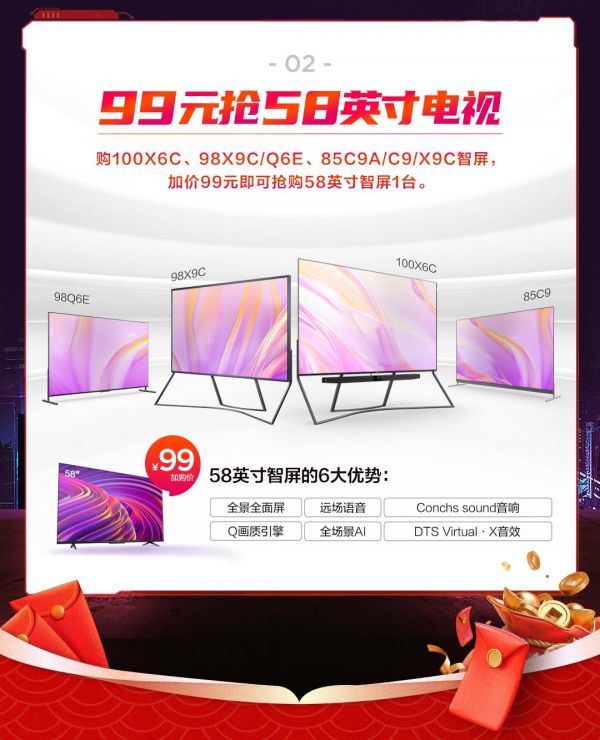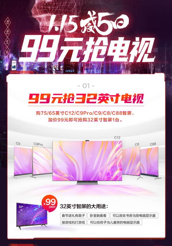 其中,购买75/65英寸的C9A/C9Pro/C9/C8/C88电视,加99元即可抢购32英寸智能电视!