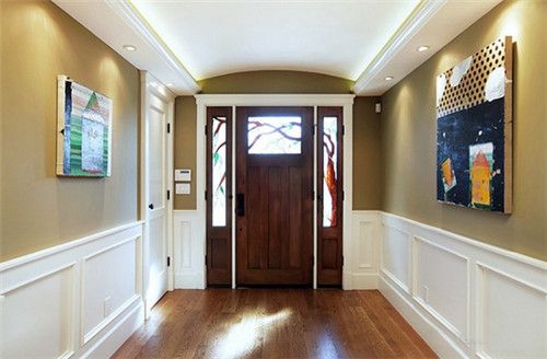 这是一套实木加玻璃的进户门,当阳光从玻璃照射到室内木地板上时会散发出耀眼光芒,为居室增添几分温暖。此外玻璃门能直接看到外面情况,并提前做好准备迎接客人的准备。实木门坚固耐用,清新自然,带有几分怀旧气息。