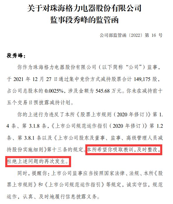 深圳证券交易所在对格力电器出具的监管函中指出,段秀峰作为珠海格力电器股份有限公司(以下简称“公司”)监事,于2021年12月27日通过集中竞价方式减持股票合计149,175股,占公司总股本的0.0025%,涉及金额为545.68万元。该减持计划未在减持前十五个交易日预披露。