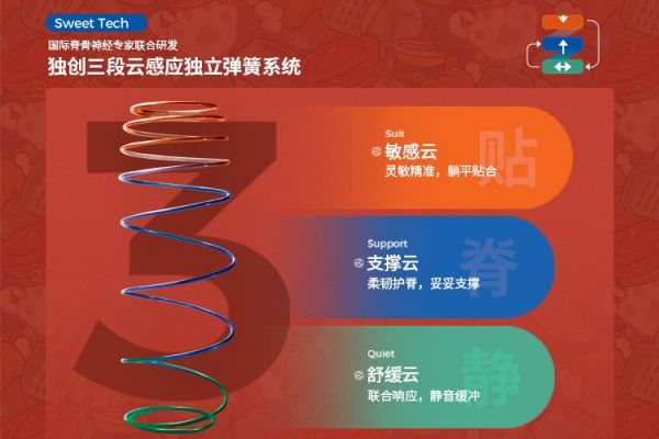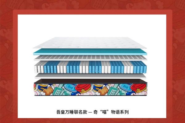 吾皇IP定制床垫使用独家“三段云感应弹簧”核心技术,敏感云:灵敏精准,躺平贴合;支撑云:柔韧护脊,妥妥支撑;舒缓云,联合响应,静音缓冲。窝在柔软舒适的床垫上,好似躺在云端,感受床垫带来的温柔承托。腰部仿佛被一双温柔的手缓缓托起,轻柔舒适,身体被包裹,完美贴合颈部,感觉呼吸都顺畅许多。无论你是侧睡还是仰睡,床垫都能敏感灵活地感应到人体不同部位释放的压力,根据每个部位受力点和受力程度的不同给予精准支撑,达到舒缓身心、安神助眠、修复矫正脊椎的效果。