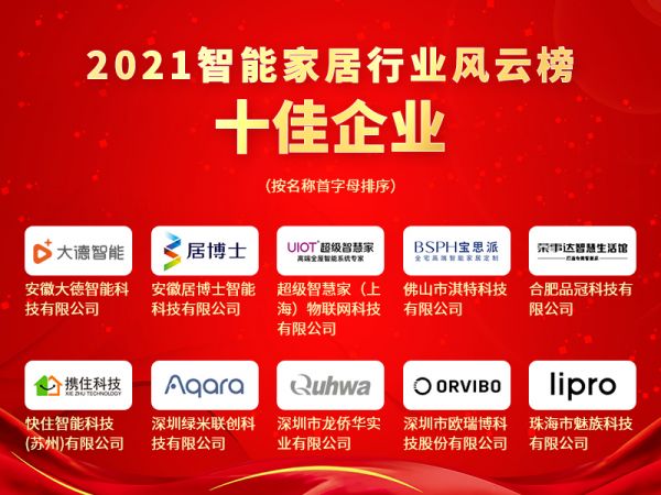 荣获智家网“2021智能家居行业风云榜”十佳企业的有(按名称首字母排序):
