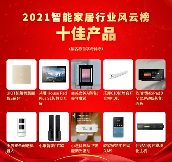 荣获智家网“2021智能家居行业风云榜”十佳产品的有(按名称首字母排序):