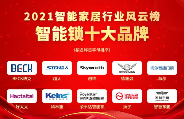 荣获智家网“2021智能家居行业风云榜”智能锁十大品牌的有(按名称首字母排序):