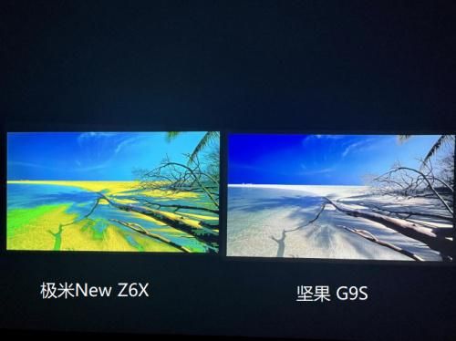 性能带来的直观区别还有,投影仪是否能能处理好画面的噪点,即考验降噪功能是否优秀。坚果 G9S(右图)的等高线降噪非常成功,基本上将每一个应当表现出来的细节都完美的展现出来了,更符合原画面。而极米 New Z6X(左图),天空等高线部分明显,颜色泛白发绿、水面更是被错误的当作等高线噪点一并抹除造成一片黄的情况,由于降噪能力没跟上,极米 New Z6X 产生了大量的颜色缺失。