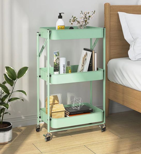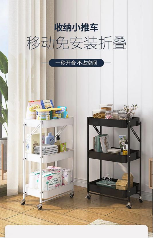 伟经这款北欧风格免安装置物小推车可以放置在阳台或者客厅,安装或者收起的时候轻轻一拉,不需要拆卸,轻松折叠,平时不常用的夹缝空间均可放置。这款置物小推车是上中下三层设计,可以将盆栽、装饰画和一些小物件整齐摆放,显得温馨又灵巧,目前有白色、黑色、樱花粉、薄荷绿等颜色,采用碳钢材质打造而成,美观又实用。