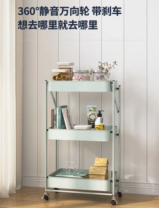 伟经这款置物小推车配有360度旋转的万向轮,可以随意移动。除了客厅外,阳台,浴室、厨房、书房都可以使用,想固定在某处,只要上锁万向轮,稳定不溜动。