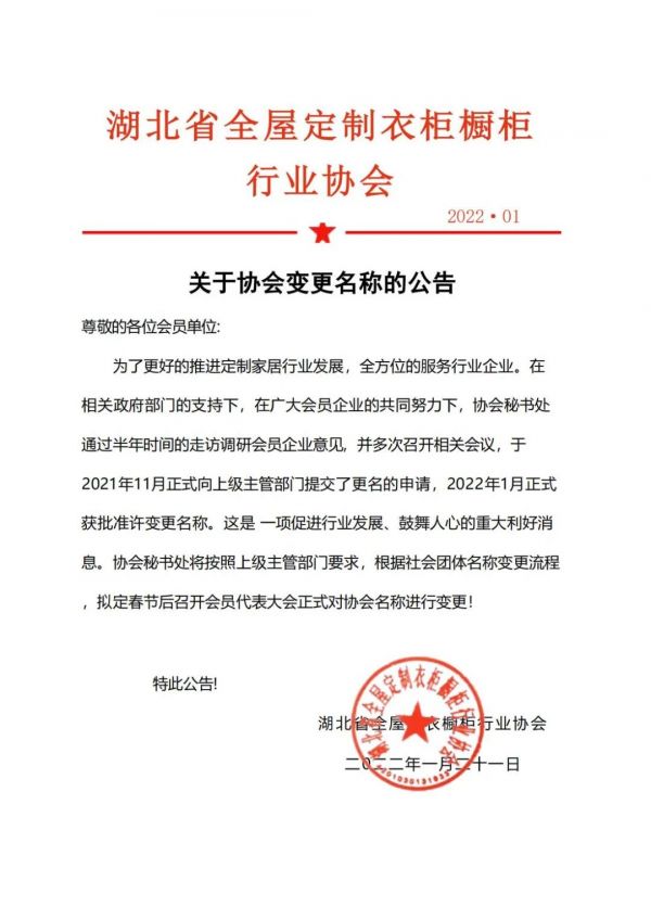 为了更快的促进行业发展,全方位服务好行业企业,湖北省全屋定制衣柜橱柜行业协会名称正式变更为“湖北省定制家居协会”,并已发以下变更公告:
