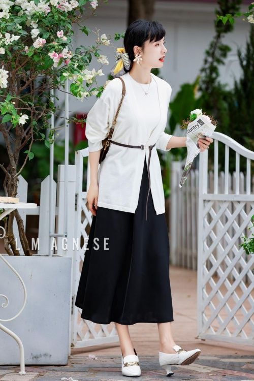 黑白色穿搭在职场上永不过时,简爱格妮斯这套服装搭配简洁、大方,给人一种干练知性的感觉。高腰半身裙包容性很强,搭配圆领白色内搭与一件同色开衫,腰间的腰装饰凸出曲线。整套上身很显瘦,搭配一双白色小皮鞋与上衣呼应,花朵耳环和黄色头饰点缀又在黑白色中间吸睛,这一套简约时尚的look职场穿搭不容易撞衫,精致感十足。