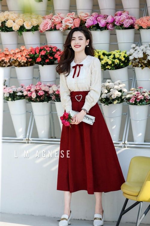 职场穿搭除了干练利落的职业感以外,还有温柔优雅风穿搭也是很多职场人所热衷的。简爱格妮斯这套少女蕾丝上衣搭配红色长裙,将优雅两字展现得淋漓尽致。白色公主领蕾丝上衣与珍珠扣相呼应,个性简约的红色半身裙,腰间心形珍珠修饰更有文艺感。脚下搭配一双白色高跟鞋,金属装饰点缀高级感满满,整套穿搭十分吸睛。