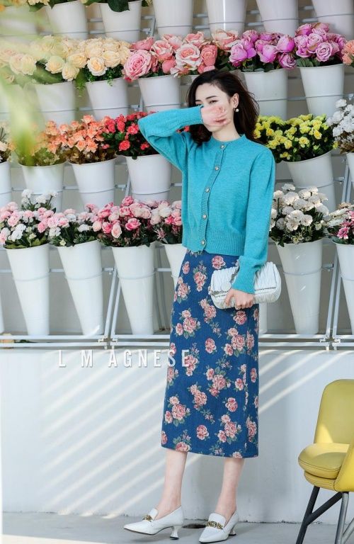 针织开衫柔软舒适,给人感觉气质温柔。简爱格妮斯新春推出的这件湖蓝色针织开衫,干净清澈,玫瑰花型金属扣质感十分精致。再搭配一条复古牛仔蓝半身裙,满身的玫瑰印花设计是整条裙子的亮点,裙长适中,完美地拉长脚踝到小腿部分视觉感。此外,在珍珠耳环、手拿包以及白色高跟鞋的加持下,整套同色系穿搭衬托出职场女性时尚又显瘦的高挑感。