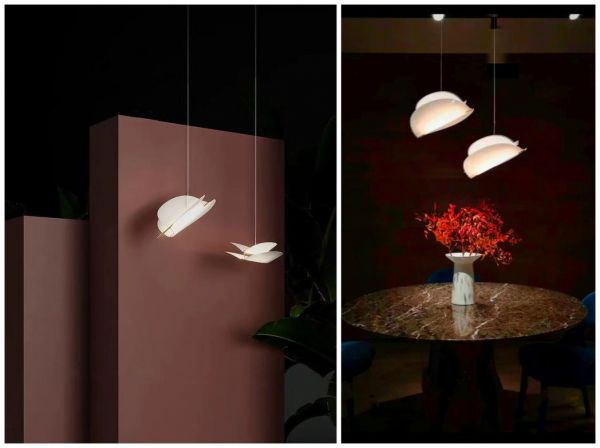 这是一款模拟蝴蝶飞翔的姿态设计的吊灯——“心翼·如翼”。双层“翅膀”构成折射与反射,将光巧妙地分配在雾面灯罩上,30%向上,70%向下,既满足实用需求,又富有观赏性。拥有触控尾部金属杆和遥控开馆2种控制方式,操作简单方便。采用2700k色温的LED光源,可无级调光。一雄一雌翩翩飞舞的蝴蝶,立体感强,有着夫妻形影相随的美好寓意,为空间注入馥郁的浪漫气息。