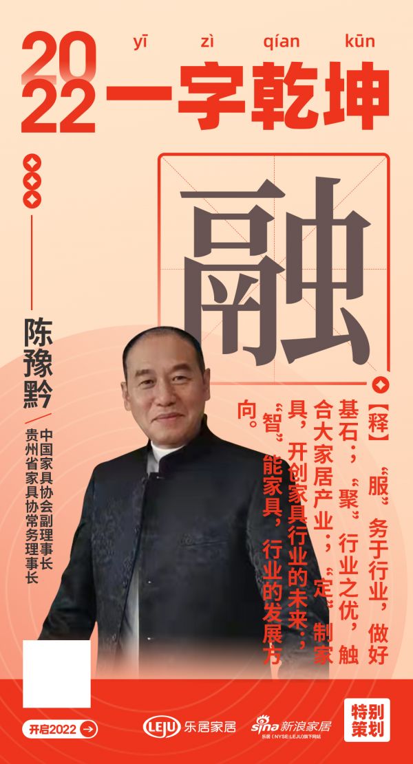 在“2022一字乾坤”活动中,中国家具协会副理事长、贵州省家具协常务理事长陈豫黔用「融」表达了2022年的规划和目标: