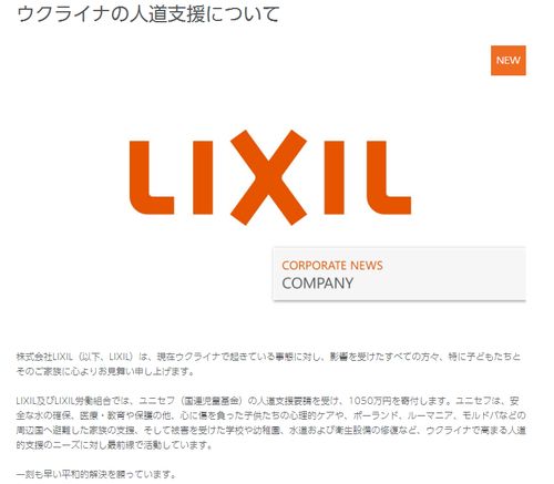 据骊住3月2日公告称,该公司已接受联合国儿童基金会的人道援助要求,捐赠1050万日元(约人民币57万元)以帮助受战争影响的儿童。联合国儿童基金会将向受影响儿童提供安全用水、医疗及教育,修复被破坏学校及幼儿园的下水及卫生设备,同时对向乌克兰周边国家避难的家庭提供援助。