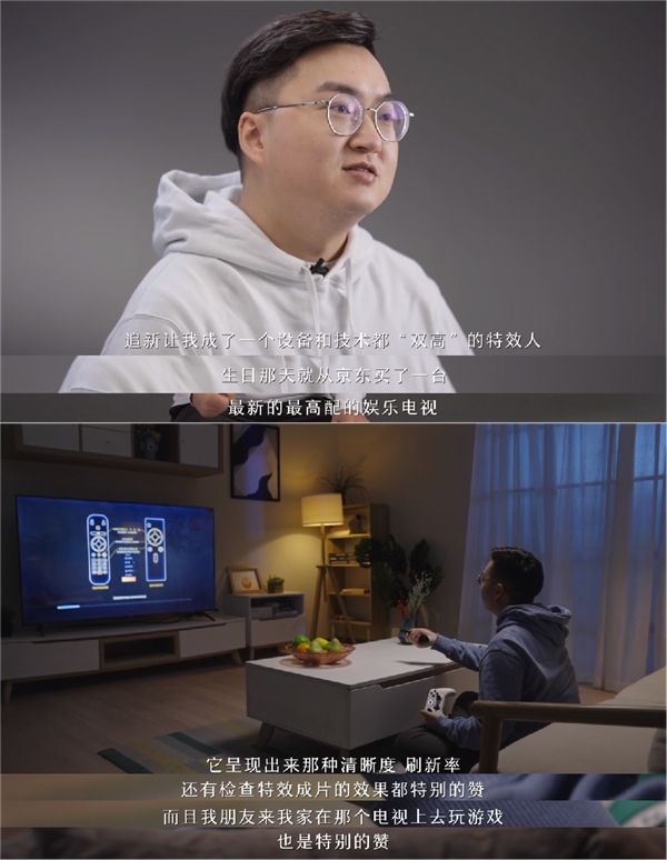 对于从小就爱看科幻电影的影视t效师来说,“追新是靠近梦想”,就算做着别人眼中的不稳定工作,也要坚定的把兴趣干成事业。看着他的付出和坚持,朋友从之前的不解劝阻变成满是真心实意的支持。当小显示屏装不下梦想,朋友们就第一时间买来检查t效成片效果更好的超清晰、高刷新率、高配置电视大屏给他做生日礼物,周末和朋友们用大屏欢聚畅玩是他放松身心的诀窍。他说,追新让他和朋友走得更近,还成了技术和设备“双高”的专业t效人。