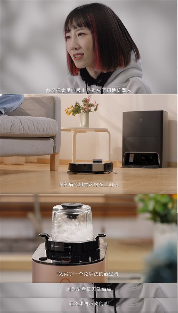 对于从高薪职业转行的猫咪美容师来说,“追新是更懂自己”,每个人在成长和选择中都要清楚自己更想要什么,而不是把人生框定在别人的观念里。因为爱猫,对职业的追新让她从工作的压力中解脱出来,而家电追新则带给她生活和身体的双重放松。在整天沉浸在洗猫猫、打理猫毛的体力活后,她马上更新了家里的家电装备。能自动清洁的扫地机器人帮她摆脱24小时手动除毛的恐惧、能不用手洗的破壁机帮她每天多睡半小时。新家电让她有更多属于自己的私人时间,去过自己想要的生活。