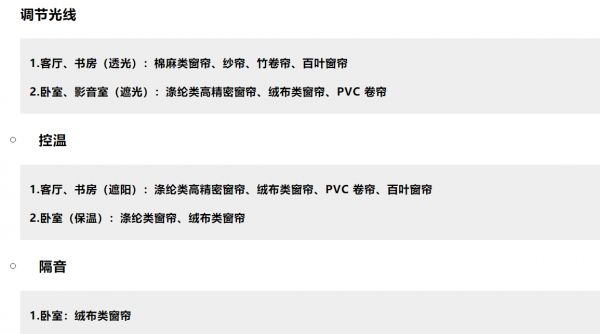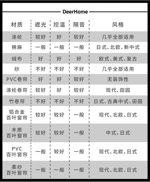 上面这张总结图可以了解不同形态、材质窗帘的在功能上的优缺点,以及适合的风格。