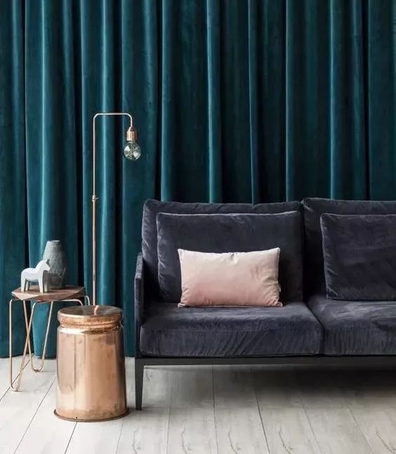 灰度高、明度低的颜色更不容易出错,也更高级。这两年,市面上有一种用合成纤维制成的「雪尼尔」面料的窗帘,它也是丝绒的质感,不过不像天鹅绒的绒毛那么长,是又短又丰满的一层。它的手感很柔软,相比天鹅绒低调且花色丰富,更适用于大多数风格的房间。另外类似的还有植绒,是让绒毛带电后吸附到涂有粘合剂的布上所制成的。它的绒比雪尼尔还要细,价格也要相对更便宜些。相比其他窗帘,植绒窗帘有个无可比拟的优点,就是不倒绒。