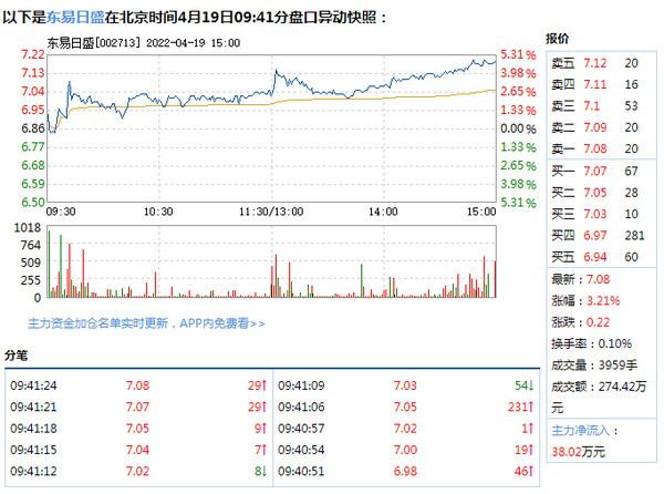 新浪家居讯 4月19日,东易日盛盘中快速上涨,5分钟内涨幅超过2%,截至9点41分,报7.08元,成交274.42万元,换手率0.10%。