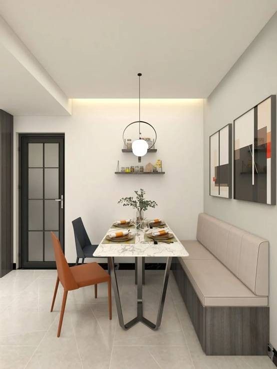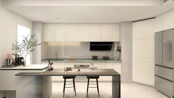 高级灰,调色盘中的一种极致演绎。得天独厚的表现力让我们一眼就爱上它。就像这套配色,简约格调的装饰技巧与高级灰的优雅质感结合,为我们呈现了一个低奢艺术、沉静诱人的厨房&餐厅空间。台面线条色与石膏线的勾勒,强化着墙面的立体感与层次性,增加奢华质感,
