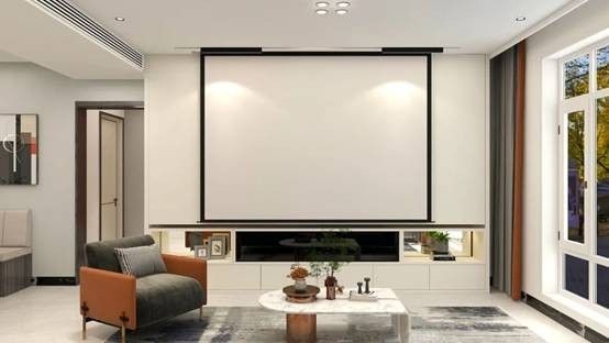 在客厅的设计上,客厅电视背景墙做整面电视柜兼书柜功能,使用投影幕布、激光电视,摒弃传统电视。把空间加入不同高级灰色调,进行层层晕染,诸如天灰白色调的柜体、地毯与沙发,配搭虽不复杂但在各种因素的相互中和下却使得空间充满了一种奇妙的氛围:冷静、优雅、舒适而轻奢诱人。