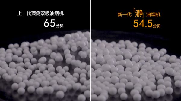 在风量相当的前提下,上一代顶侧双吸油烟机最大档位噪声为65.0dB(A),「瀞」油烟机仅为54.5dB(A),降噪效果非常明显。为了形象的体现噪音对耳膜的不良影响,中国家用电器研究院还做了一个有趣的小球实验,让噪音看得见。噪声强弱的差异通过小球的振幅的差距明显的展现出来。