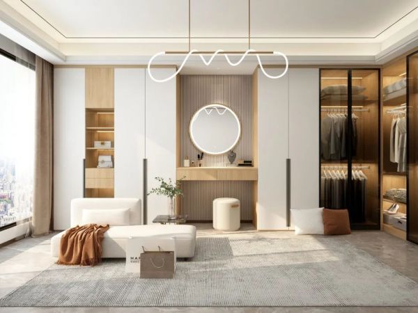 在衣帽间里,梳妆台往往是和衣柜一起设计定制的,既可以保持风格统一,又能在最大程度上节约空间,搭配可以显示天气、时间的智能化妆镜,让生活更便利。