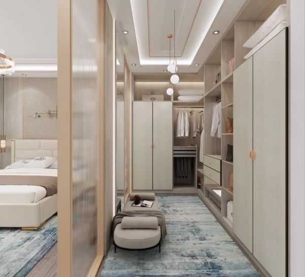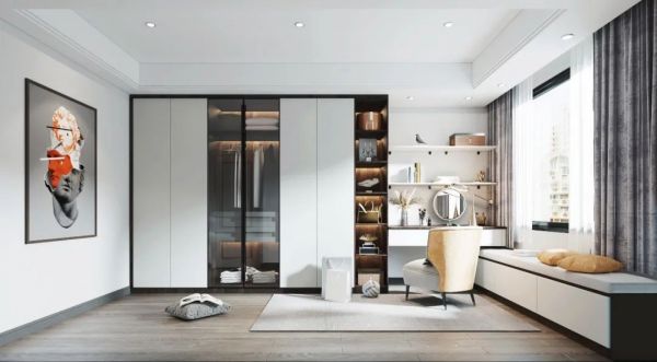 如果没有多余的独立空间,而主卧空间又足够大的话,可以试试用柜体隔出一个衣帽间,也可以做成开放式设计,动线方便,整体性更强。