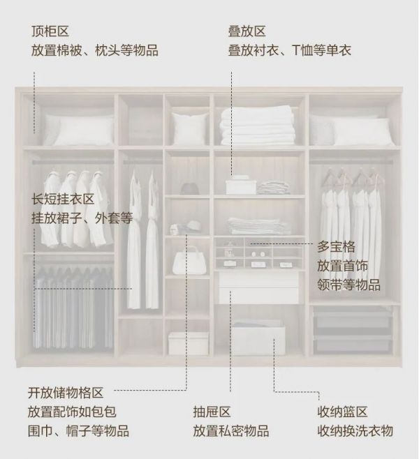 为了提高整理衣物和配饰的效率,衣柜内部最好根据衣物的季节、长度,遵循“上挂下抽”的格局来进行分区,主要包括被褥区、挂衣区、叠放区、抽屉区,衣物收纳更井井有条,翻找也更快捷。