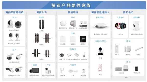 萤石构建“1+4+N”以安全为核心的智能家居生态,以萤石云为中心,搭载包括智能家居摄像机、智能入户、智能控制、智能服务机器人在内的四大自研硬件,开放对接环境控制,智能晾晒,智能影音,智能门禁,智能会议等子系统生态,实现家居及类家居场景的全屋智能。