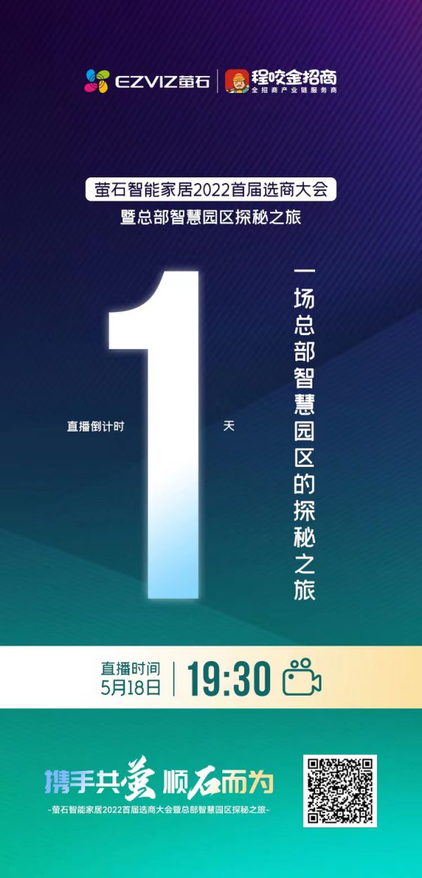 5月18日19:30,萤石智能家居2022首届选商大会暨总部智慧园区探秘之旅直播专场将准时开播,足不出户云上探秘,重磅政策限时发布,现在加盟时机更好,期待与您携手共赢!