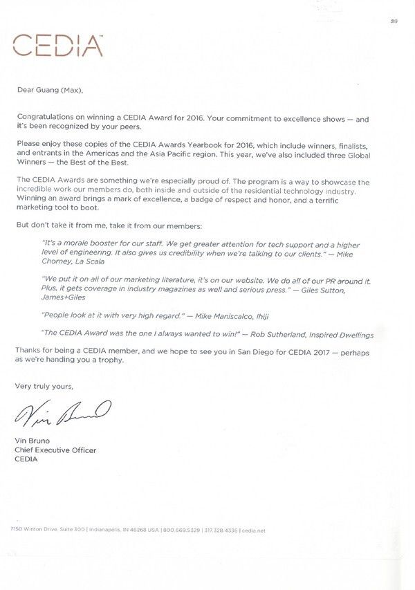 者尼智能影音成立至今,一直领跑于影音智能定制安装行业。不仅早早加入了美国CEDIA协会,更凭借15年的家庭影院项目经验与追寻卓越的执着,2010年起接连荣获CEDIA协会16项大奖,2016美国.达拉斯CEDIA颁奖礼中,者尼代表亚太区最终在全球300余个参赛项目脱颖而出,获得了全球“BEST HOME THEATRE”大奖!是亚洲少数有此殊荣的智能影音定制安装系统集成商,也将中国定制安装行业带到了前所未有的新高度!