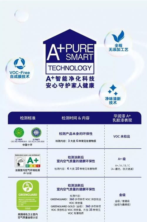 华润乳胶漆怎么样?华润乳胶漆A+ 系列凭借独有的以国家专利:VOC-free自成膜技术(专利号:20101021156.8)为代表的A+智能净化科技,使得配方原料无需再添加额外成分,即可使涂料在涂刷后自行交联成坚韧漆膜,保证了完工后空气质量的纯净环保,从而保护家人远离TVOC(总挥发性有机化合物)的危害。