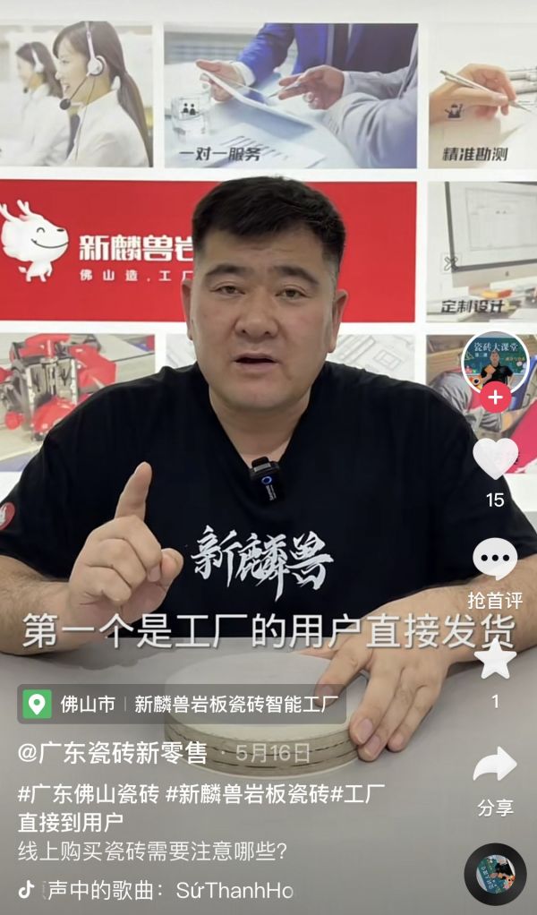 产品带来的差异化和优势在用户端表现明显。据新麟兽授权主播“刘老师讲设计”介绍,岩板坯的瓷砖通过与普通瓷砖对比,在直播间受到粉丝的广泛喜爱。“新麟兽本身就是正宗的佛山生产产品,这种产地优势对我的粉丝就有很大吸引力,并且产品花色很新,通过直播间从厂家直达用户手中,这都是传统购买渠道所不具备的,六月上新的岩板坯55°新品,更是让粉丝买不停。”