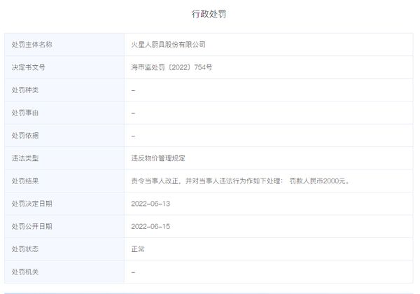 据爱企查显示,火星人厨具股份有限公司(以下简称“火星人”)新增1则行政处罚。