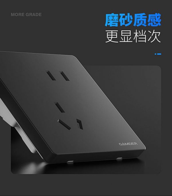 设计师在研发产品时,坚守创新,以突出开关与众不同的气质。开关面板中间的黑钛金装饰条,显得时尚而且十分具有标志性。这个细节也正是V31系列有别于同类开关的明显特征之一。英文LOGO“GAMDER”则使得开关更洋气,更国际化。