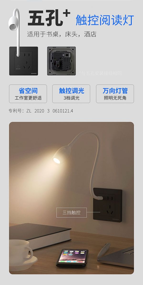 五孔+新功能插座,是V31系列设计的一大亮点。它包含五孔+小夜灯,五孔+人体感应灯,五孔+触控阅读灯。插座与照明双重功能组合,是一种创意,一种突破。五孔+新功能插座在室内的运用,不仅十分实用,而且为用户带来新体验,增添生活乐趣。